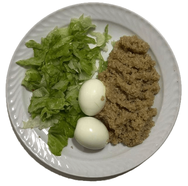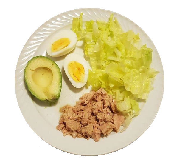 • El plato contiene: Medio aguacate, Un huevo talla L, 100 gramos de atún, y Medio plato de escarola