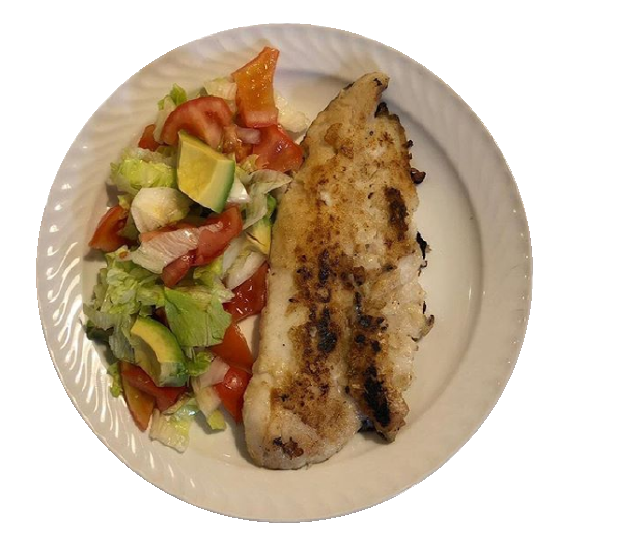 Hoy les mostramos este plato que contiene 150 gramos de pescado (Merluza) y mitad del plato de ensalada (Aguacate, tomate y escarola).